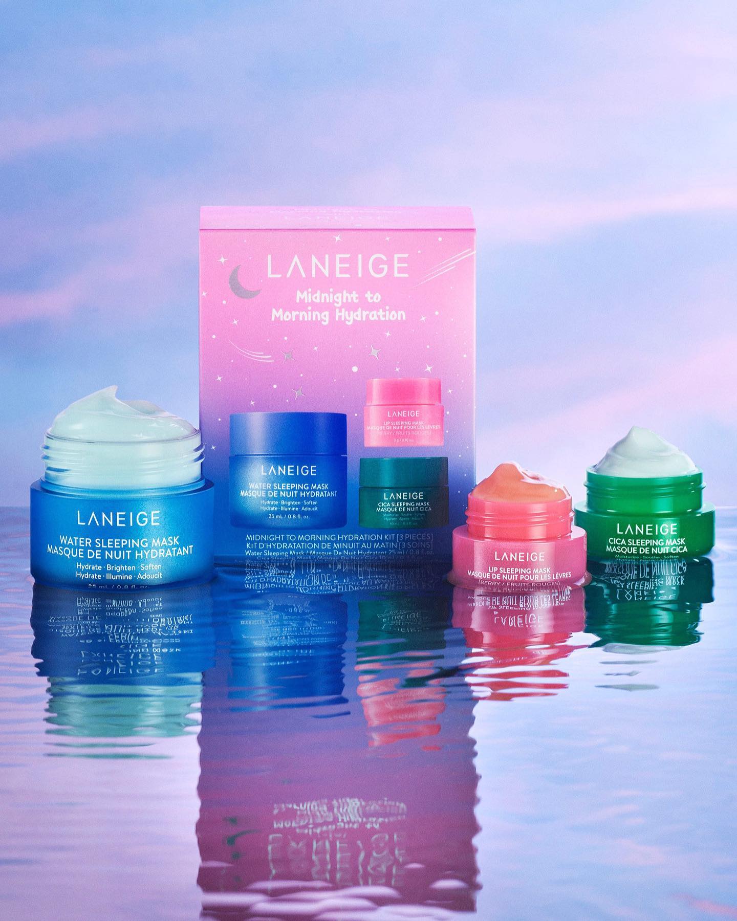 Sit back, relax, and let our Midnight to Morning Hydration set take the night shift Our hydrating sleeping masks are now all in one set! Featuring a deluxe mini Water Sleeping Mask, and mini Lip Sleeping Mask + Cica Sleeping Mask, the Midnight to Morning Hydration set has you covered from sundown to sunrise.